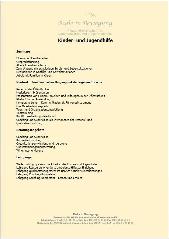 Weiterbildung Systemische Arbeit in der Kinder- und Jugendhilfe Lehrgang Ressourcenorientierte ambulante Hilfe zur Erziehung Lehrgang Qualitätsmanagement im Bereich sozialer Dienstleistungen Lehrgang Coaching-Kompetenz Lehrgang Coaching-Kompetenz - Lernen und Erholen