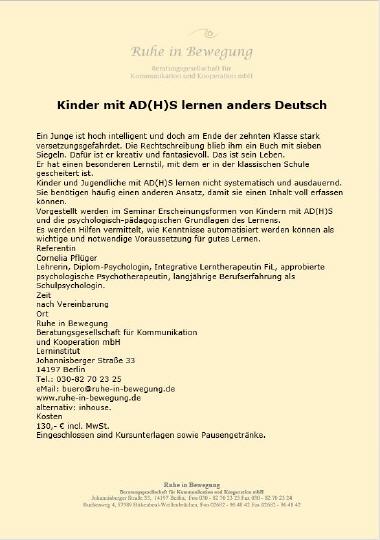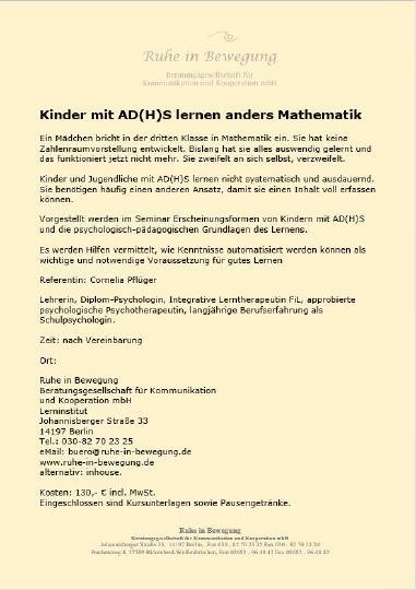 Vorgestellt werden im Seminar Erscheinungsformen von Kindern mit AD(H)S und die psychologisch-pädagogischen Grundlagen des Lernens.