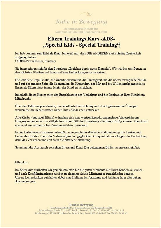 Eltern Trainings Kurs -ADS- „Special Kids - Special Training“